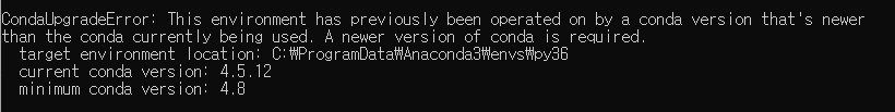 CondaUpgradeError: This environment has previously been operated on by a conda version that's newer